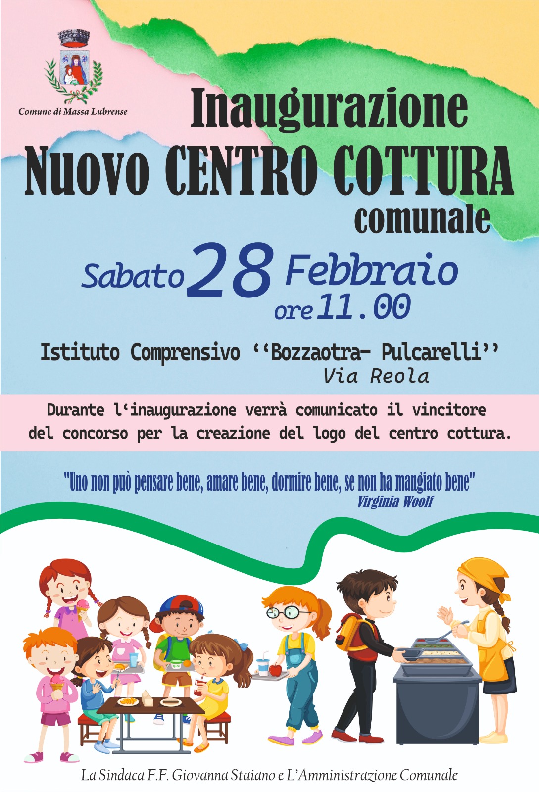 Lo avevamo promesso alle famiglie, ci abbiamo sempre creduto insieme, ricevendo fiducia e appoggio, dopo mesi intensi di lavori, sopralluoghi, contraddittori tesi al miglior risultato possibile, siamo felici di annunciare che sabato 28 febbraio inaugureremo il nuovo "CENTRO COTTURA" comunale, un importante e fondamentale passo avanti per i servizi alla nostra Comunità. Continuiamo il nostro percorso di vicinanza alle famiglia per decidere imsieme il meglio per i nostri figli. Taglieremo insieme il nastro e poi visiteremo ogni angolo del nuovo, nostro, Centro Cottura, vi aspettiamo numerosi, grandi e piccini, perché è tutto più bello quando è condiviso!